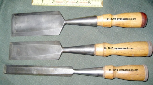 One-owner Greenlee bevel edge butt chisels include the widths: ¾, 1 ½, and 2 inches. They all have similar solid leather end handles. The blades are clean, but lightly tarnished. All three share a mark of 2 filed notches high on the sockets—surely an owner’s mark. Easily Good+