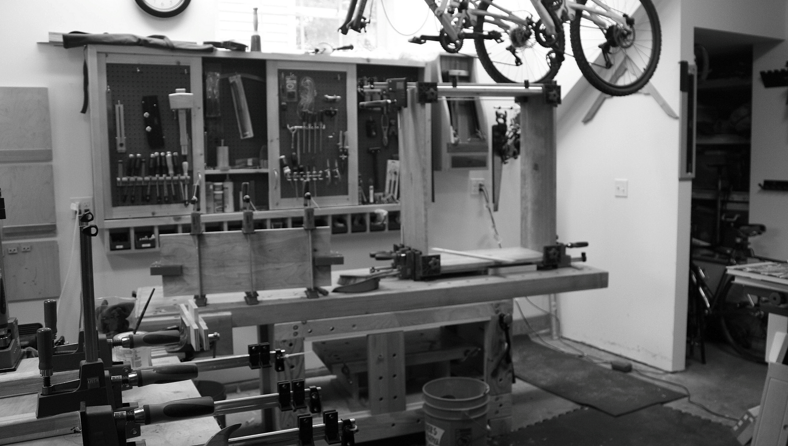 I used to have my workbench away from the wall in the middle of the garage.  On the recommendation of Mr. Schwarz and in need of space to put things together, I moved my workbench next to the wall under the tool hanging cabinet.