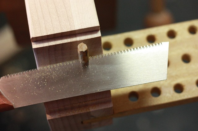 Here’s how it turned out. Notice the 1/16″ gap. Darn! The tenon was a perfect fit prior to pegging. Figured it out yet?