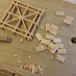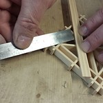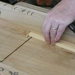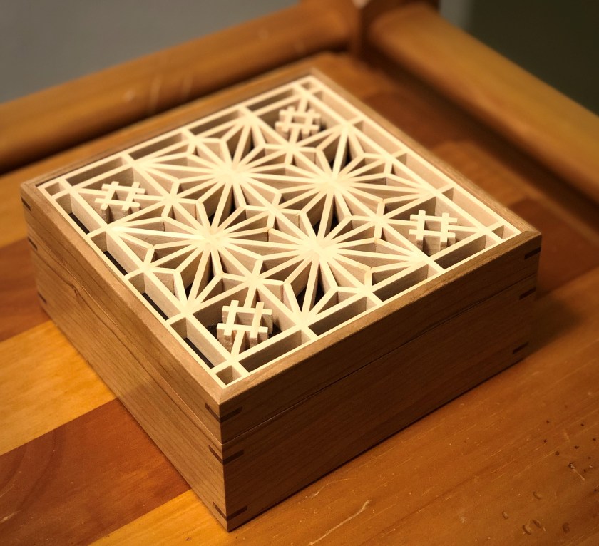 We started with beautiful strips of cherry that had dadoed grooves for the bottom, lip of the box and a groove for kumiko (the largest groove in the picture). Spray glue was used to attach the paper to the bottom and edges eased. Shellac was applied to the grooved side of the cherry board.