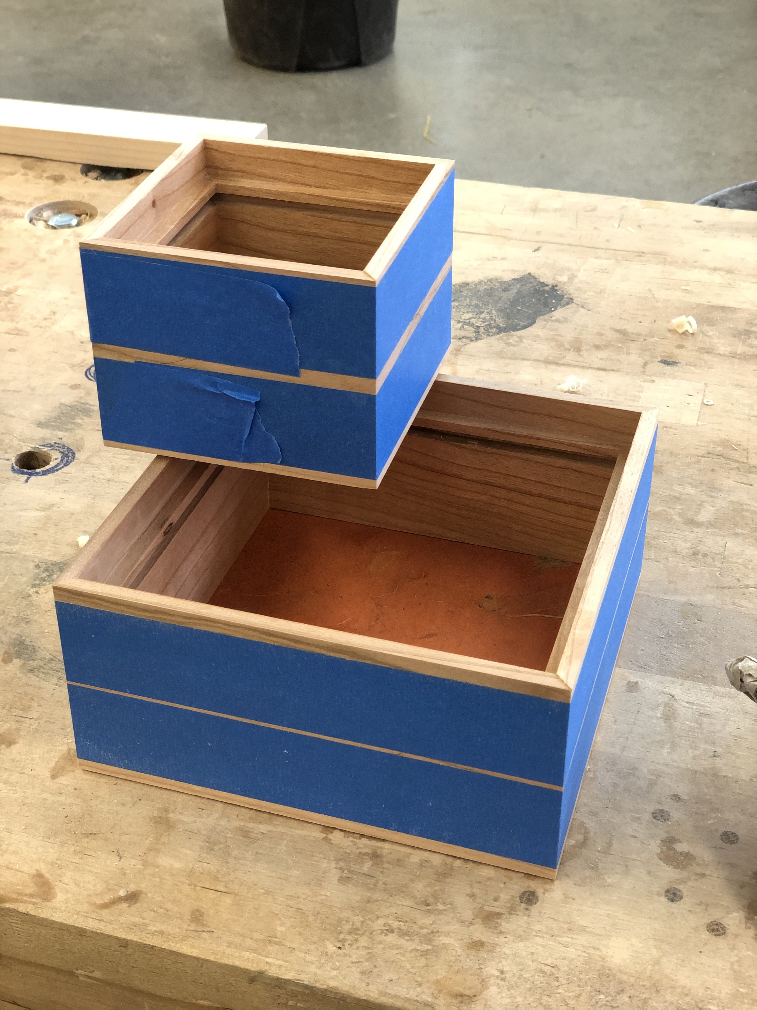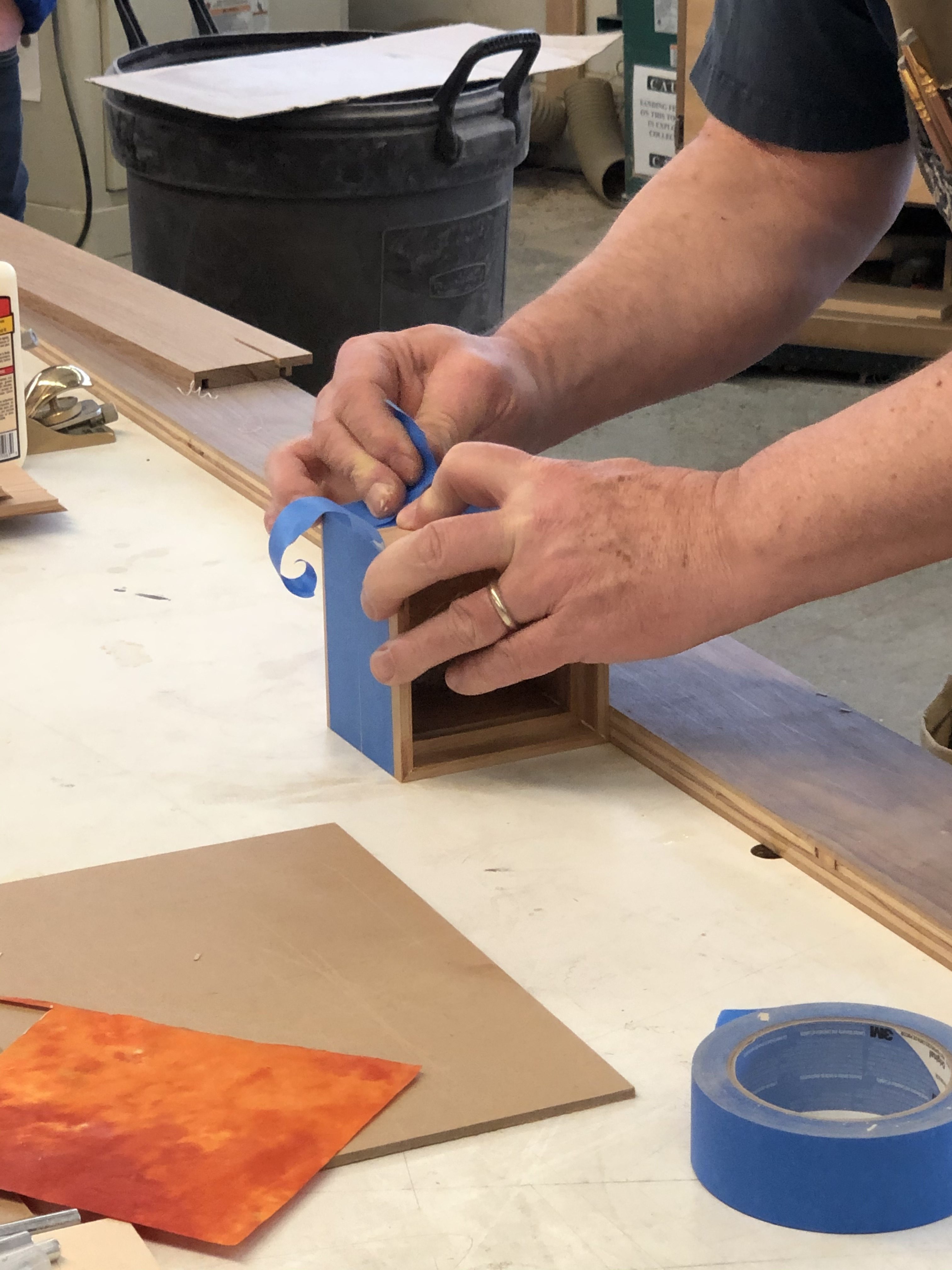 Box sides were lined up against a straight edge, glued and clamped using blue tape.