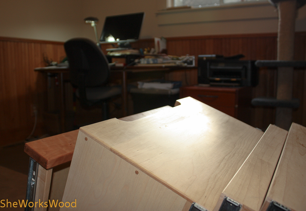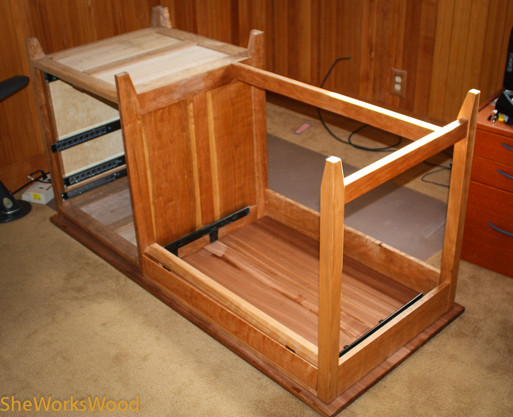 The pull out key board is drying in the garage and I still need one more knob for the doors. But, at least for this weekend, there’s no more time to work on it. Finish is Daly’s Profin over one coat of shellac.