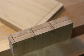 At this point the chest is completely together, no clamps , no glue and no banging on tight fitting dovetails. Glue is brushed into each opening , then a wedge driven in which spreads the pin tight against the dovetail socket and at the same draws the joint down against the shoulder, completely avoiding the need for clamps.