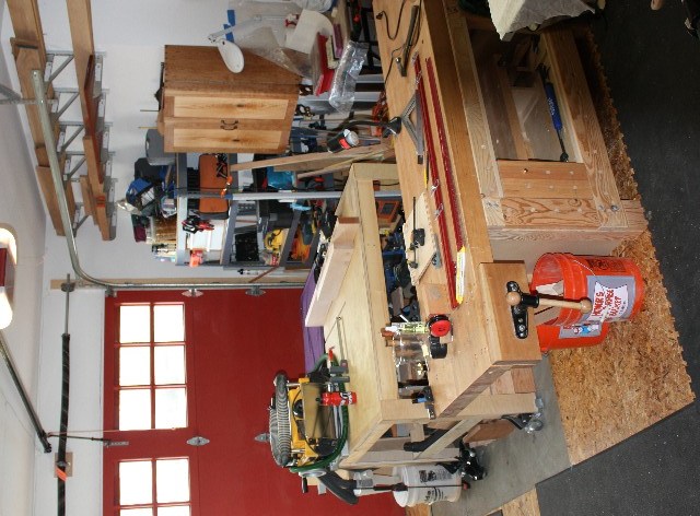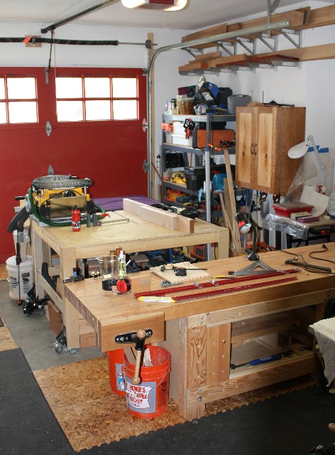 The center of my shop is my workbench. I have some over head wood storage on both sides of the garage.