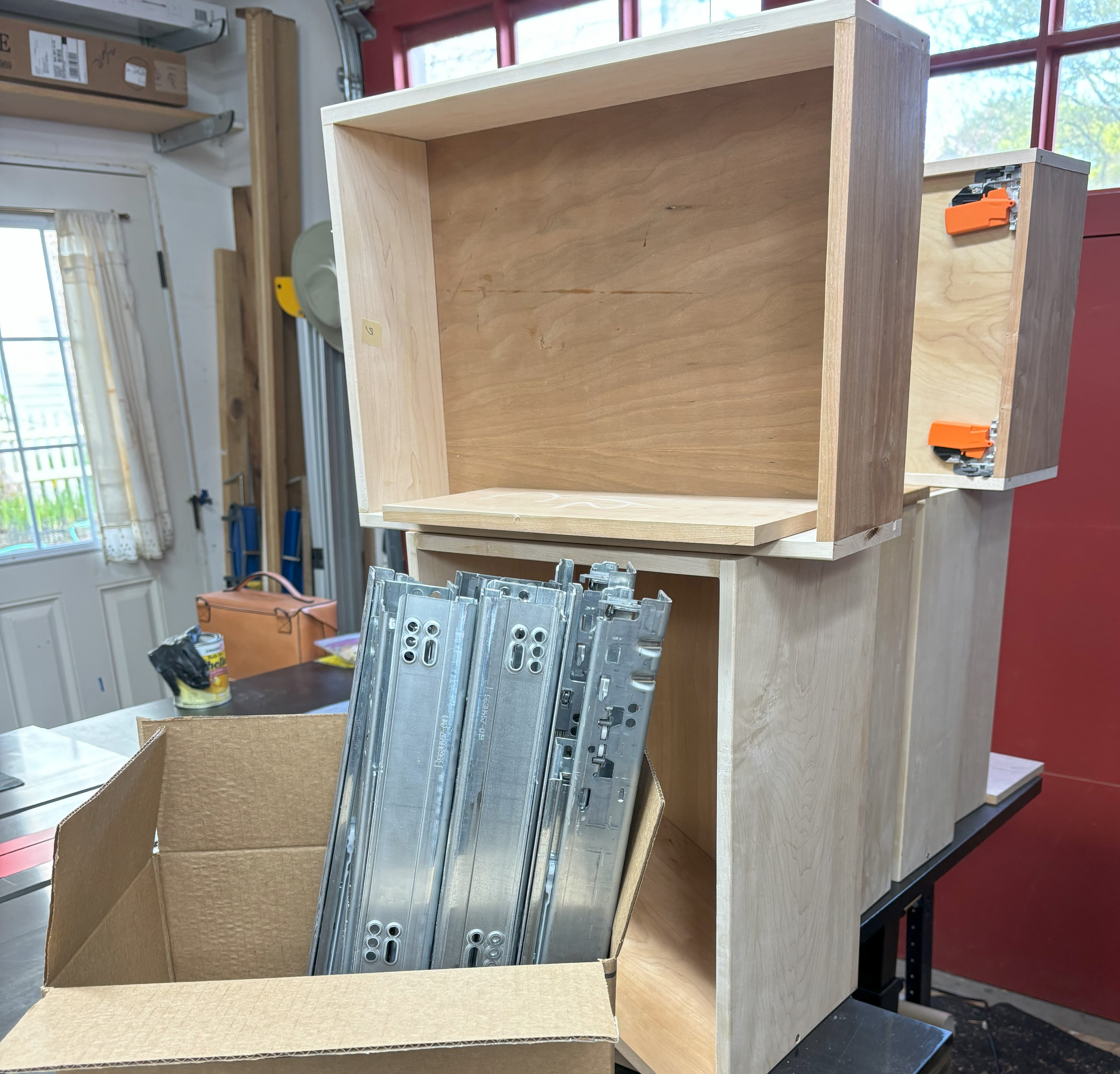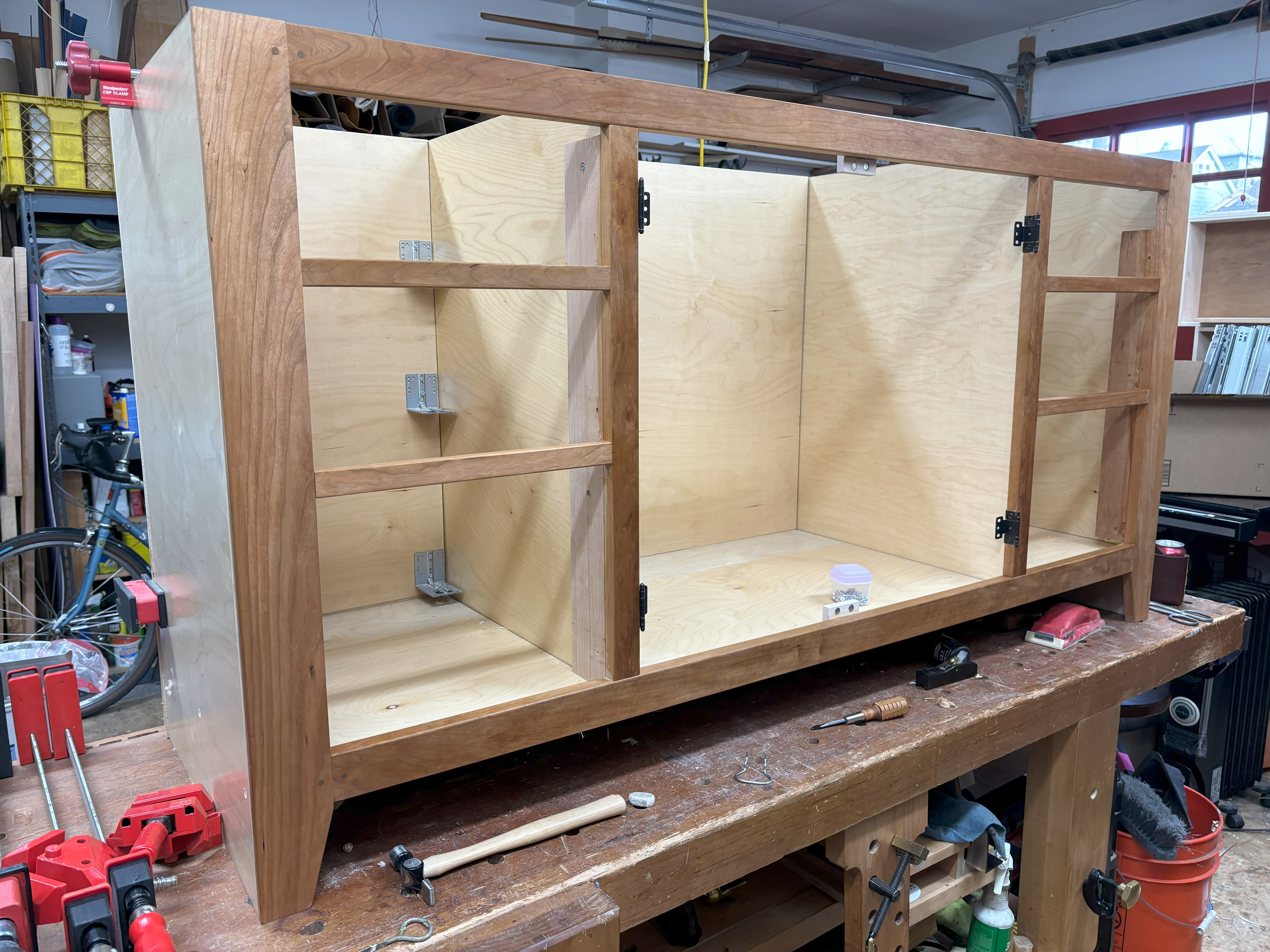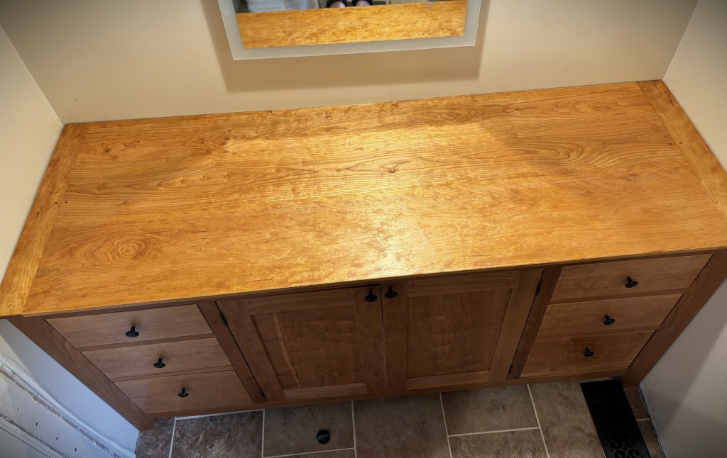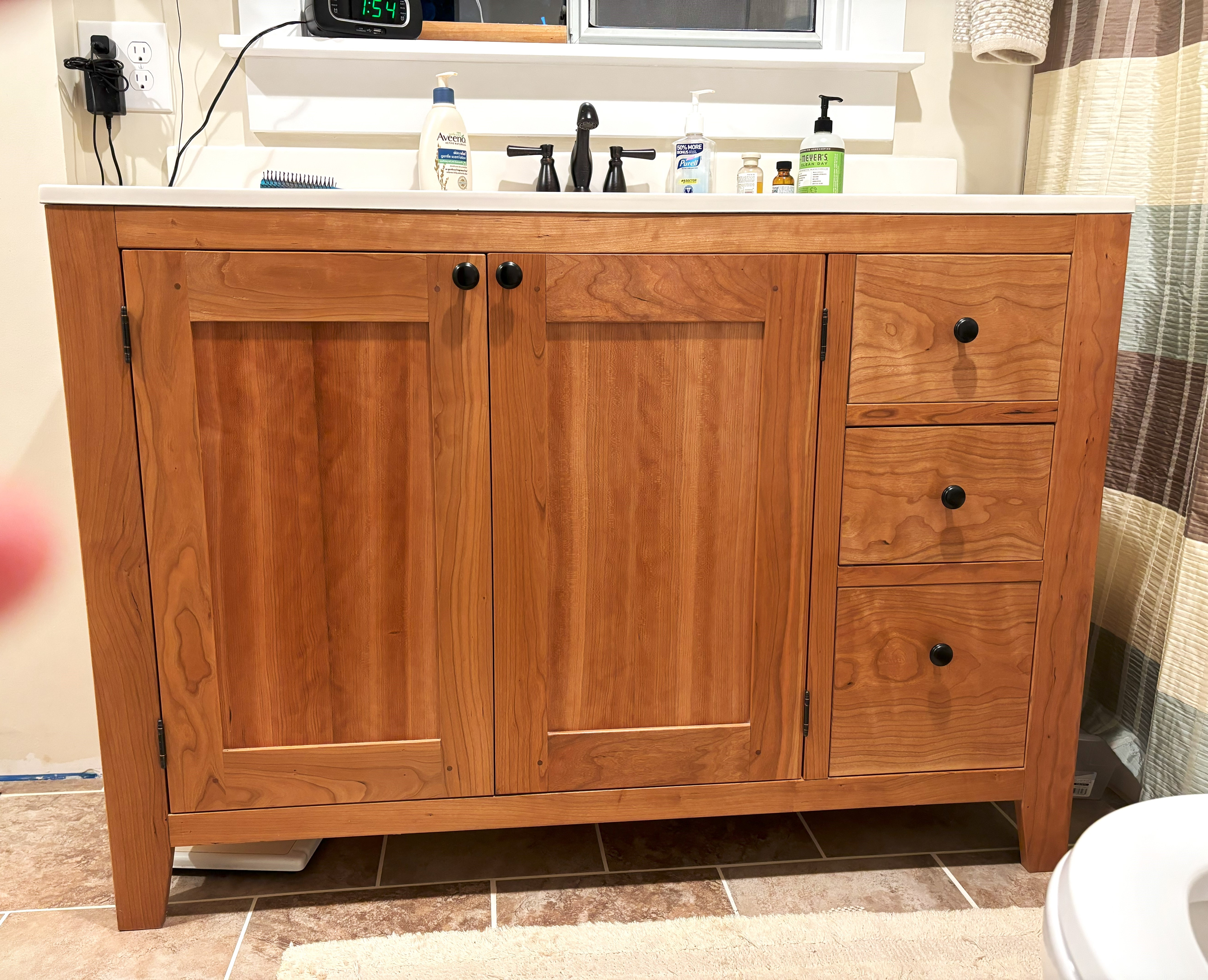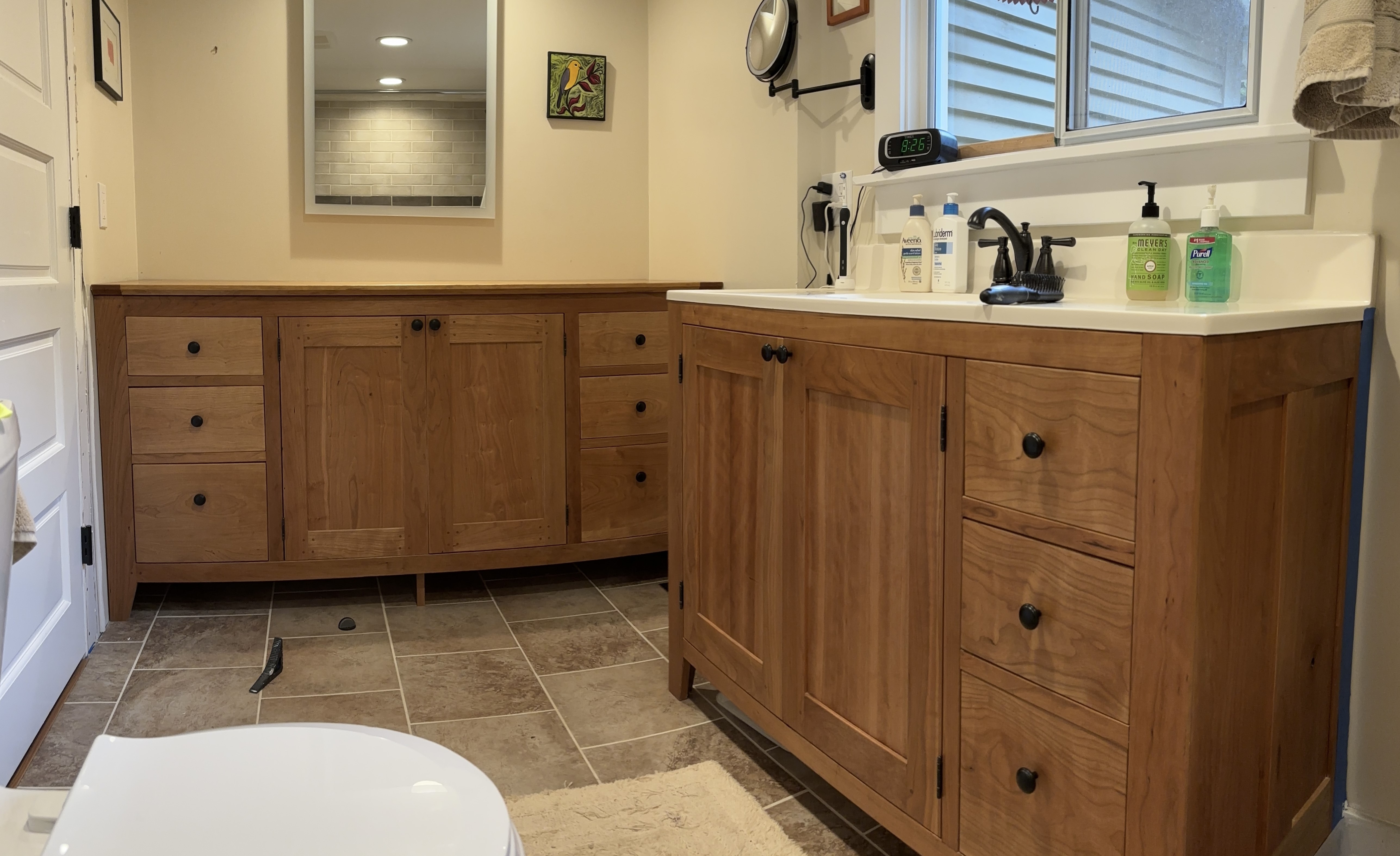 In my previous post, I mentioned the second vanity was coming. Here’s a picture of both cherry cabinets that I made. Once a little bit of finish trim is done this project will be complete!